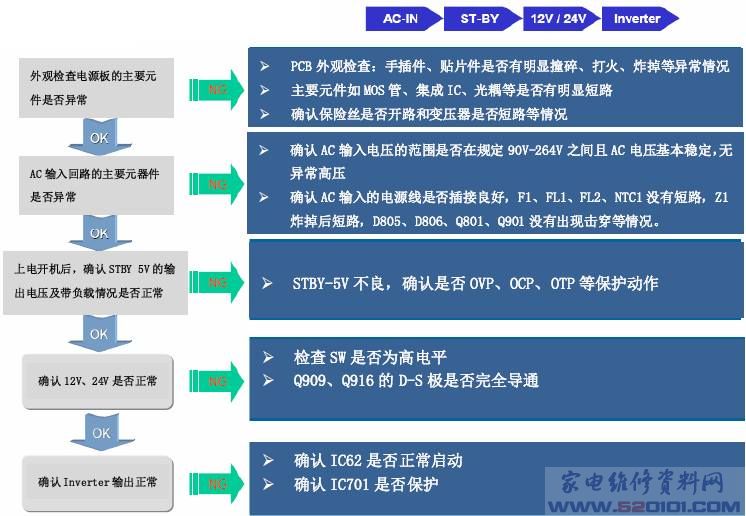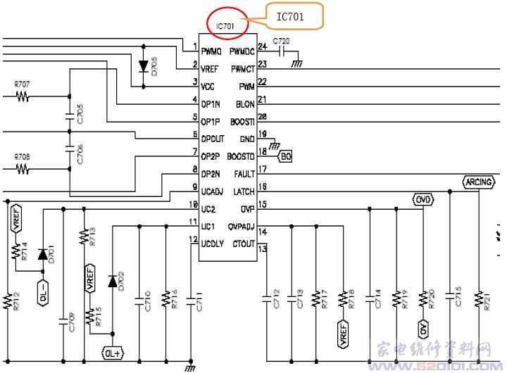 4)、IC701反馈、保护检查 -.将IC701的第12、13脚分别对地短路,看机器是否可以正常启动,由此可以确认机器是否发生OC/UV/OV保护; -.将第17脚对地短路,看机器是否可以开起来,由此可以确认初级侧是否可以开起来; -.量测第4脚电压是否可以上冲到第5脚电压,由此可以确认反馈电路是否正常。