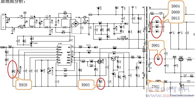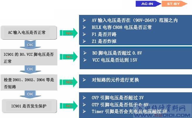 5、Standby-5V不良维修实例: 故障现象:开机后5V无输出 检修方法:通电后5V无输出,VCC冲到15V启动电压后,量到IC901 Timer充电到5V发生的死机。根据不良现象初步判断是过流保护,可能的不良位置有5V/12V输出整流元件被击穿,5V/12V输出短路,T901短路,R928阻值变大,R903阻值变大。 故障原因:输出短路或OPP线路上阻值异常导致OPP保护。