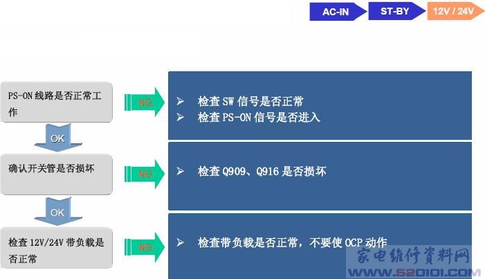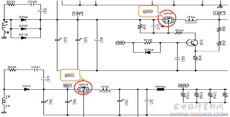 2)、检修输出端短路 发现IC901 OPP保护动作并且又找不到不良位置在哪里,可以把二次侧Q905和Q909拿掉,用万用表量测5V和12V是否有电压,以缩小检修范围。