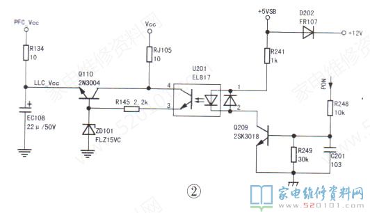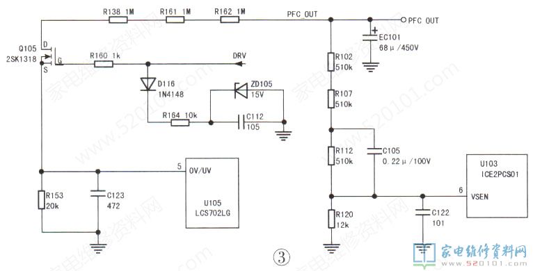 二次开机后,PON信号为高电平,Q209饱和导通,光耦U201①、②脚内部的发光二极管发光,③、④脚阻值变小,待机变压器绕组提供的vcc电压加到ZD101负极,三极管Q110导通,串联稳压输出13.8V 电压,分别送给PFC芯片U103(ICE2PCS01)及主电源芯片U105。上电,测得Q110发射极电压为13.8V,正常。查阅资料,发现LCS702LG①脚是VCC输入,⑤脚(0V/UV)是市电输入检测端,外接PFC电压检测电路,如图3所示,通过检测PFC电压来判断输入电压是否正常。