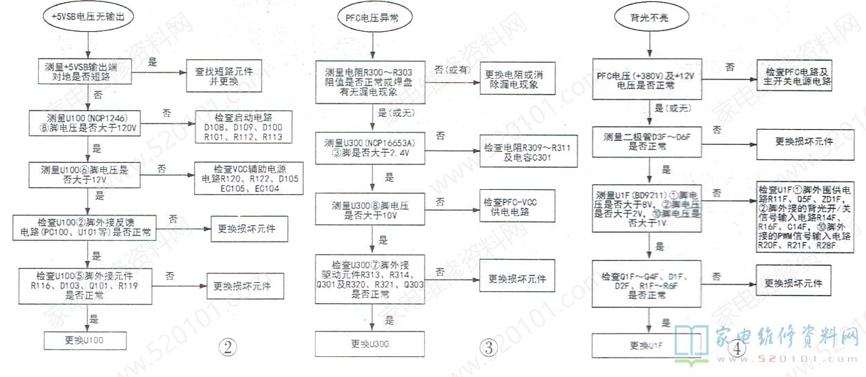 海尔LQ65S81液晶电视采用AY205D-4SF01型电源二合一板,其输入电压为AC130V~264V,开关电源输出电压为5VSB/1A、12V/5A,LED驱动电路输出电压为-156V(或-191V )/330mA x 2。AY205D- 4SF01型电源板除用于海尔多款超大屏幕(大于55英寸)LED液晶彩电外,还用于暴风、熊猫等品牌60英寸~75英寸LED液晶彩电中。该电源主要由交流输入及EMI滤波、PFC (功率因数校正)、副电源(输出5VSB电压)主电源(输出12V电压)和LED背光驱动电路组成如图1所示。