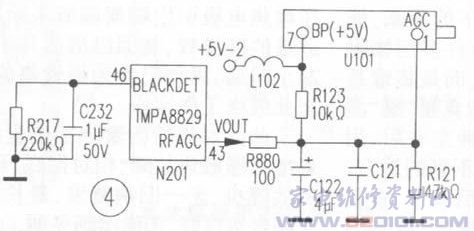 故障排除:先检测I2C总线电路并进入I2C总线查看相关数据,并无异常。于是分别测量高频头U101①脚、N201(TMPA8829) 43脚的RF AGC电压,所测得的电压值均在0.8V~1.1V左右波动(正常状态下,该电压应在2.7V~2.9V左右波动),从有信号时动态电压有波动分析,表明RF AGC控制电路是起作用的,只是控制能力降低,分析N201异常的可能性较小,于是重点检查N201(TMPA8829)至U101(TECC7949VG35E)高频头①脚之间的电路元件(见图4)。检查中发现R123一端焊点不够光滑,重新将其焊牢后试机无效果,怀疑C122、C121两只电容中有严重漏电。拆下C122检测,该电容有几k左右的漏电电阻值,由于C122严重漏电,在拉低R121、R123分压点电压的同时,将RF AGC控制电压大部分短路到地,从而AGC控制能力降低,使增益下降。更换同规格正品电容后试机,故障排除。