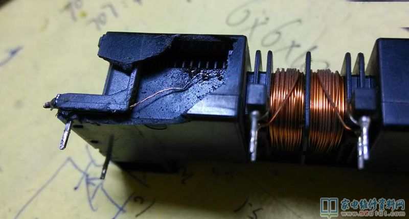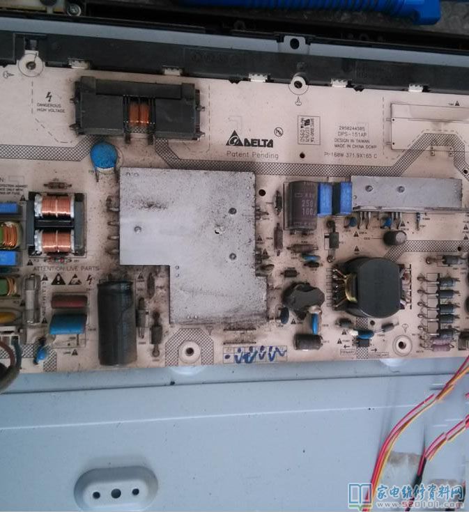 接修一台海尔液晶电视L32K1A,故障表现开机声音正常,2秒后黑屏,此机电源高压一体板,版号是DPS-151AP,拆机未见电容鼓包现象,测各输出电压正常。 交流关机,用数字表二极管档测高压变压器线圈时,有一组输出为开路性损坏,焊接后涂上密封胶进行处理。备注:此机电源待机时450V电容上有380电压,二次开机后为320V。