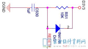 次通电工作做好准备。当D3V3 电源加电后,由于CS30 电容上的电压不能突变,只能通过RS1对CS30 充电,当电压充到3,3V 时,U2 主芯片开始启动。晶振电路异常,U2 复位端无电压。