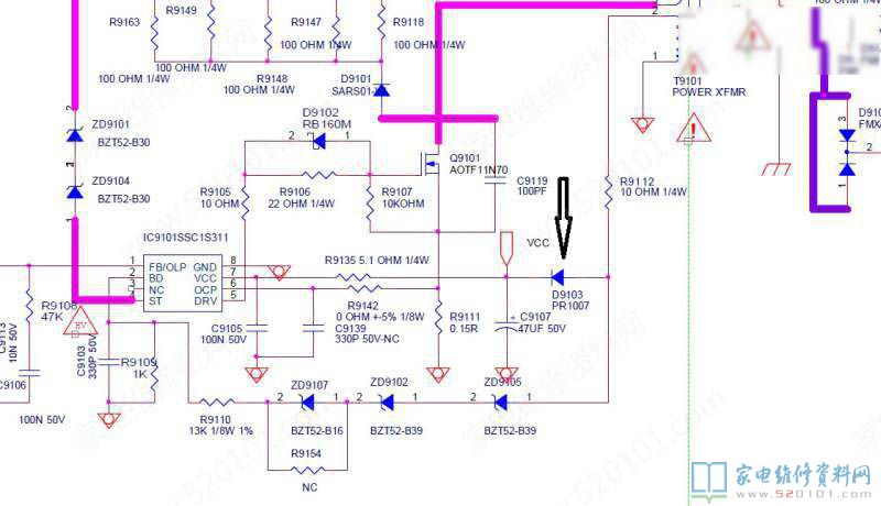 上图中,D9103是副绕组VCC电压的整流管,待机状态下测得电压11V,正常应该在12V以上,在线测D9103正向压降0.55V,偏大,拆下用FR107更换(原型号PR1007),开机后测得待机时VCC为12.9V,按键开机正常。