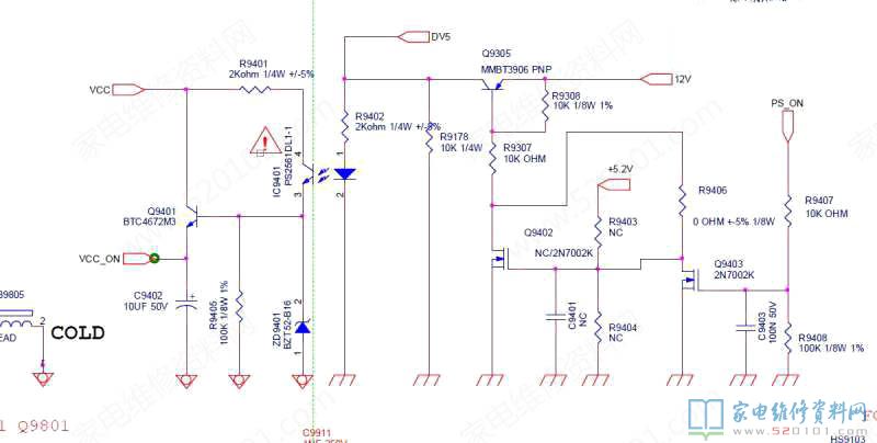LD7591T的供电来自于开关变压器副绕组,经过整流后给开关电源IC供电,同时经过光耦IC9401控制三极管Q9401输出VCC_ON给LD7591供电。意思是待机状态下,PFC电路不工作,开关电源12V输出8V经过稳压后输出5V电压供主板待机,开机后,主板输出PS_ON和ON/OFF信号电压,控制Q9401给PFC电路供电,PFC工作,输出正常的12V电压和24V背光电源。电路如图所示。