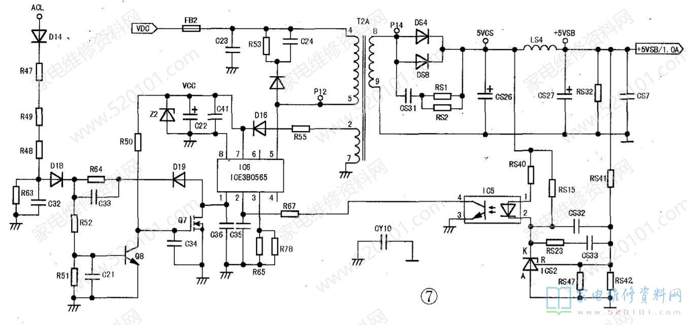 该电源板副开关电源电路如图7所示,在冷地端输出+5VSB电压,在热地端输出约15V的vCC电压。单芯片ICE3B0565( IC6 )的引脚功能与实测电压见表1。