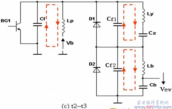t1时刻BG1停止导通,电流无法流过D1,D2.只能向逆程电容充电,直至t2时刻逆程电容两端电压达到最大值.