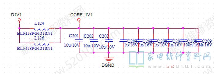 L124,L126 处的电压不对。连上测试的时候DCDC 后端电压为0.9V。与正常电压1.1V有着明显的差异,供电是不能够低于1.045V 因此判断此处供电异常。但是在未通电的情况下测试其CORE1V1 阻抗满足要求,因此确认是前端DC-DC输出问题,也就是说此供电有电压的原因是从芯片内部传回来的电压,并不是提供的电压。断开L124,L126 后确认DC-DC输出不正常。