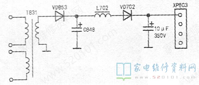 接修一台海信LED42K300型液晶电视机,背光不亮,无图像,但伴音正常。该机电源为二合一板,板号为:RSAG7.820.4688/ROH。通电试机,待机灯(红)亮;按下“待机”键,红、蓝灯交替闪烁几下,蓝灯常亮,喇叭中有海信开机语音;输入视频信号,伴音正常。此时用万用表直流电压挡测背光电压输出端XP803插座处电压为0V,但整流二极管VD853负端电压为120V,相关电路如图1所示。按理说,即使背光控制芯片OZ9902不工作,VD702负端也应有120V电压。断电后检测VD853至XP803之间的电路,发现电感L702开路。换上同型号的电感后测L702后面电路,未发现短路现象,通电试机,背光灯亮(此时测背光电压输出端XP803处电压为245V );输入视频信号,图像正常,故障排除。