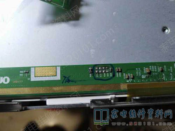 针对海信HZ65E5A液晶电视,采用的是友达屏65T50-SOD,屏幕出现竖带的故障,技改方法:拆掉边板VGH供电电阻图像正常,下图2中黑圈标注内的4个电阻即可。