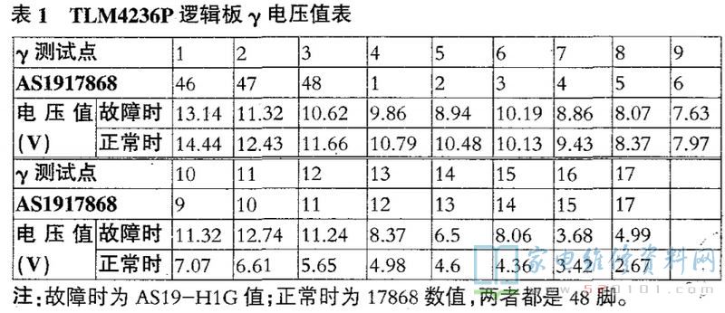 逻辑板型号为V420H1-C12型,主要器件有:CM2679B-KQ(256 脚位号U16)、AS19-H1G (48脚,位号U7(TLM4236P),y电压产生器件]电源控制芯片TPS65161(28脚)。U7 Y电压产生芯片共有17个测试点,电压值如表1所示,电源控制芯片各点电压值见表2。