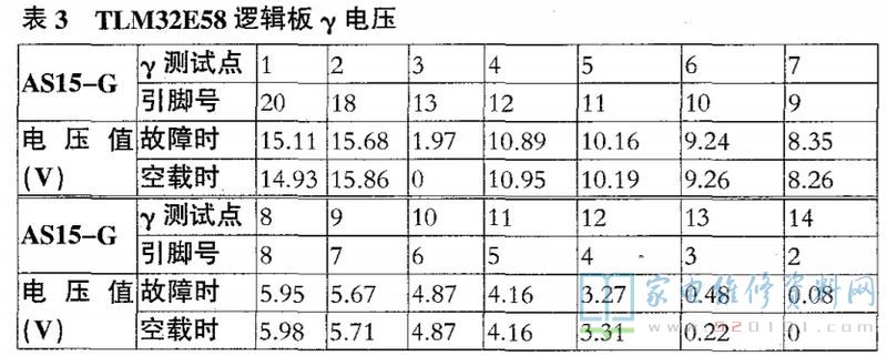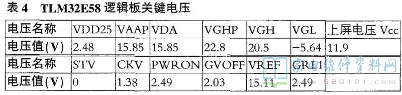 另附海信TLM32E58液晶彩电花屏时逻辑板γ电压和关键电压测试值,详见表3、表4,供参考。