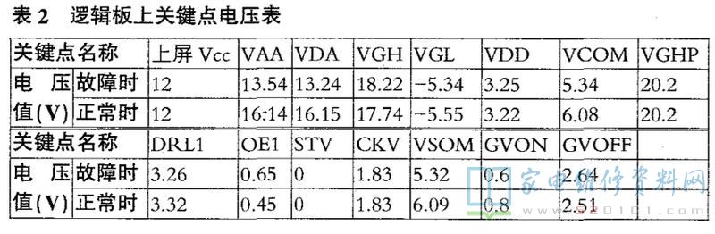 2.当逻辑板上VAA、VDA、VGH、VGL、VDD3.3的5个电压值及,上屏电压值均正常时,判断花屏故障应先通过测量逻辑板上的γ电压值来判断。如果该电压值遵循从大到小的变化规律,则花屏故障出现在主板上的可能性较大;反之则应将逻辑板与上屏插口断开再做进一步判断。空载测试γ电压数值,如所记录的数据遵循从大到小的变化规律,则花屏故障产生于液晶屏本身。如所记录的数据不符合从大到小的变化规律,而是中间有突变(两次电压不一定为一个值,微有变大或变小),则花屏故障原因是逻辑板,此时换用新的逻辑板(器件)应能解决问题。
