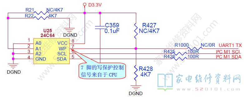 在实际的电路中我们还需要注意24CXX系列存储器的7脚有两种接法:美国AT、ST、BR公司生产的24CXX系列存储器,其7脚需接地才能写入数据:而韩国KOA、KOR、KS公司生产的24CXX系列存储器,其7脚则需接高电平才能写入数据。