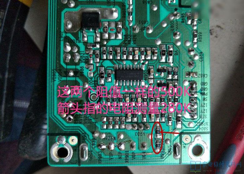 本人接修一台海信LED32K10J液晶,此机器开机后能显示LOGO图标2秒,之后黑屏熄灭,拆开机器,测量背光主电压开机瞬间180V然后下降为145V,初步开屏以为认为灯珠问题导致,经过测量每个灯珠正常,后来查背光升压电路发现两电阻是同一型号500K,测量另一个电阻值变小为280K,此电阻用烙铁烫一下恢复正常阻值,应该是此反馈电阻阻值异常导致,之后更换,再次测量主电压为240V。通电试机,一切正常。