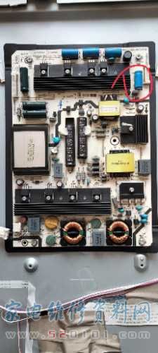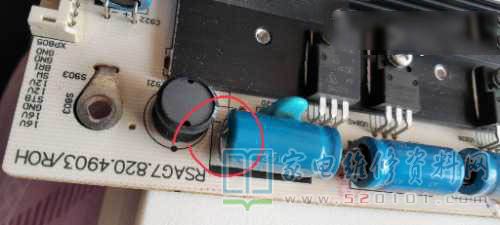 测逻辑板上屏电压正常。分别拔掉逻辑板左侧、右侧上屏排线,屏幕另一半均能正常显示。判断问题在逻辑板上。用万用表逐个检查逻辑板上的保险、二极管、电容、电阻等个头较大的元件。当检查到三只并联电容cp45、46、47时,发现两端已短路。焊开cp45仍短路,焊开cp46后cp47两端不再短路。测焊下的cp46已击穿。因该处是三只电容并联,所以干脆去掉cp46不装,开机图像正常。