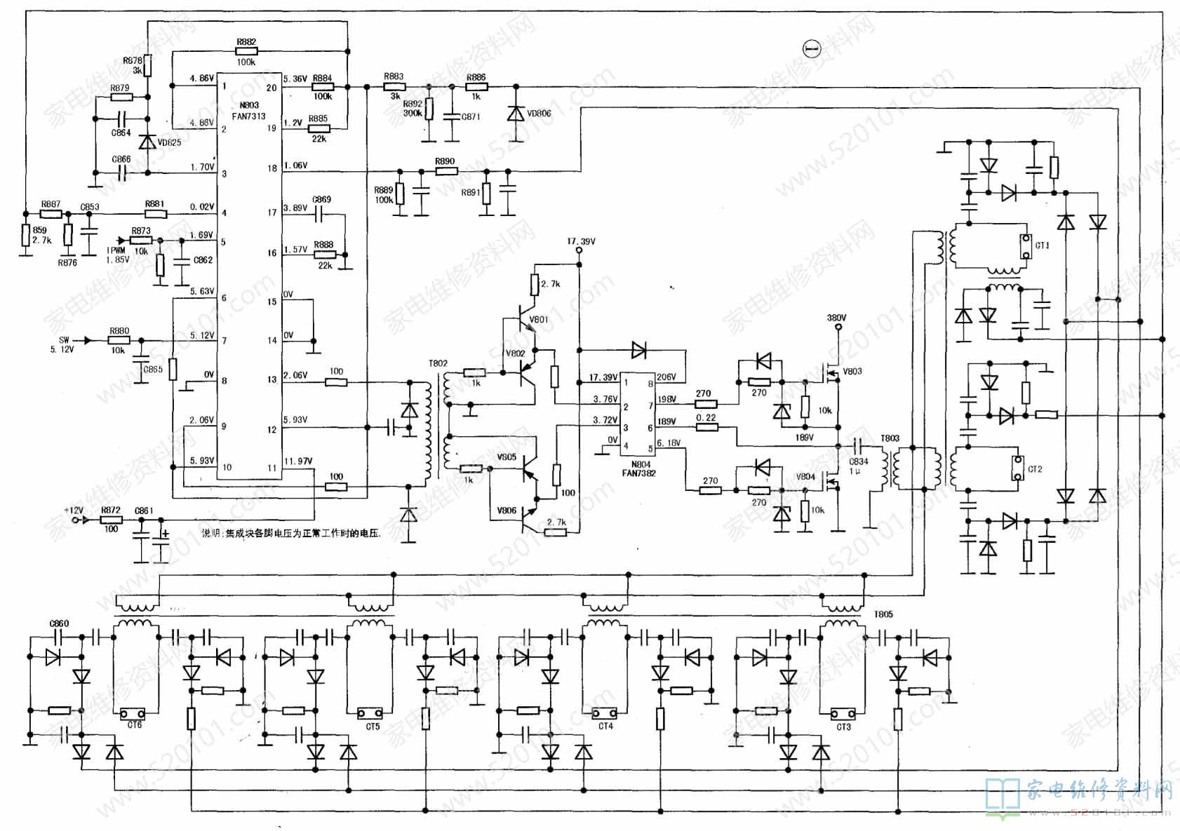接修一台海信LED50K360X3D液晶电视,故障表现为启动困难,偶尔能启动,经检测,送主板的12V电压3-9V跳变,变压器有声响,像是负载重的样子。首先换了开关电源输出的电容,故障依旧,检测300V滤波电容,容量正常。后来想干...