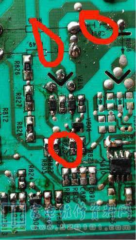 客户称中午还在看电视正常关机,晚上下班回家,开机三无(电源插头未拔下),当天曾有雷阵雨。据描述判断,该机可能遭雷击损坏。打开后盖,观察发现保险F801(6.3A )烧黑,5V控制块N901炸飞,交流220V两端阻值为0Ω,测小功率整流全...