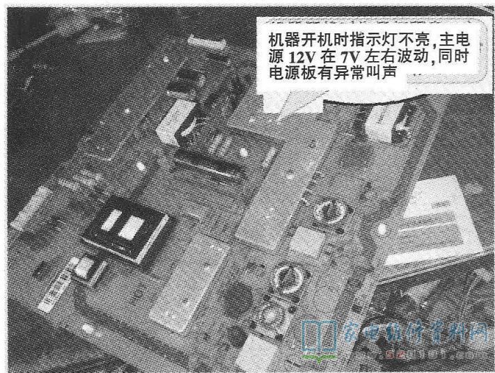 接修一台夏普LCD-40LX440A液晶电视,故障表现为不开机,指示灯不亮,测得12V输出电压在7V波动,同时电源板有不大的异常叫声(见图1)。机器属于LED机型,网上搜寻该机电源板的图纸无果,摘板维修。观察该电源板只向主板提供一种电压12V (见图2),同时主板向电源板反馈检错等信号,一时很难区分故障的范围,查看12V电压的稳压电路的431的①脚参考电位取样贴片电阻,在别的电路不导通的情况下,仅仅12V,取样贴片为6.8k和3.09k时,12V的输出电压在7V左右也是情理之中,显然是431的取样分支有问题,仔细测量有关的元件没有发现失效元件(见图3)。