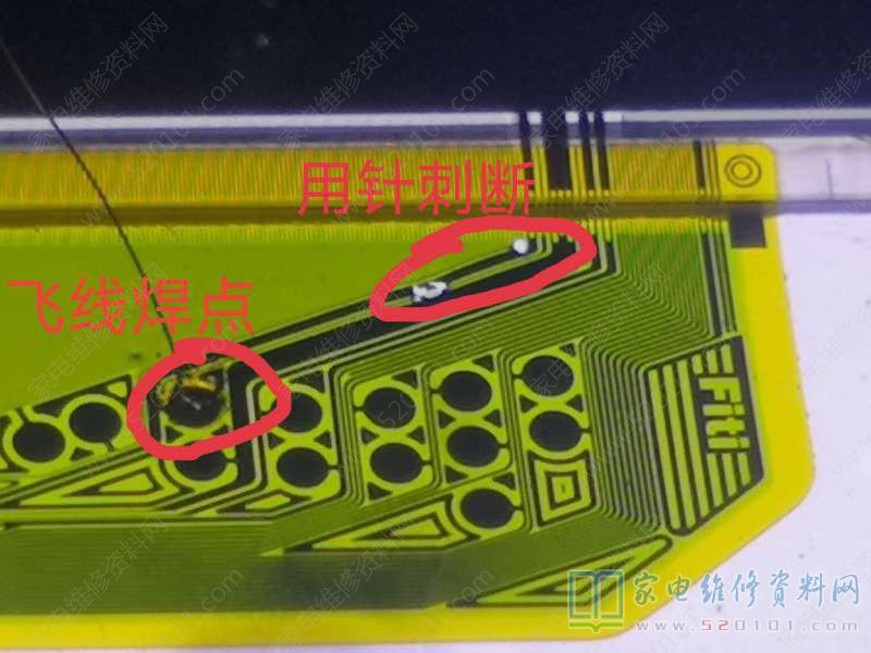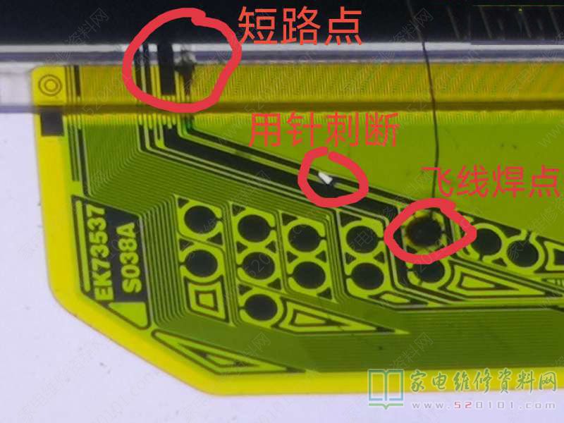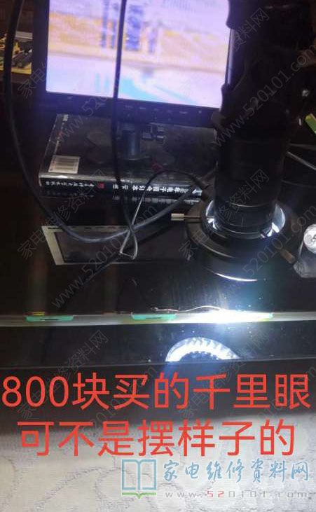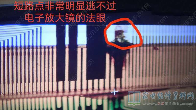 接修一台夏普LCD-60SU570A液晶电视,故障表现为图像上下一半亮度不同,折屏证实有耳朵EK73537S038A型号,网上找不到资料,根据故障现象估计不需要飞线图,上800块钱买的“千里眼”,亲眼证实耳朵一根VGH邦定点短路烧断了(修之前电压6.5V,修好25.5V),半小时搞定千万记住,修屏不要光顾飞线,隔离短路点有时也是必不可少的步骤,这张屏接好线电压是6.5V,用针刺断隔离两边后,电压才到正常的25.5V,即使接线正常也建议隔离短路点两边,不然返工几率极大。