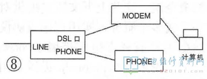 (1)仔细检查是不是按图8所示的安装线路,如果不是,很可能会造成上面的故障现象,另外如果想要安装分机(实际上就是电话的串机)的话,一定要在PHONE口后面加装,否则在有电话打进来或往外打电话时会发生断流、网络不稳等情况;