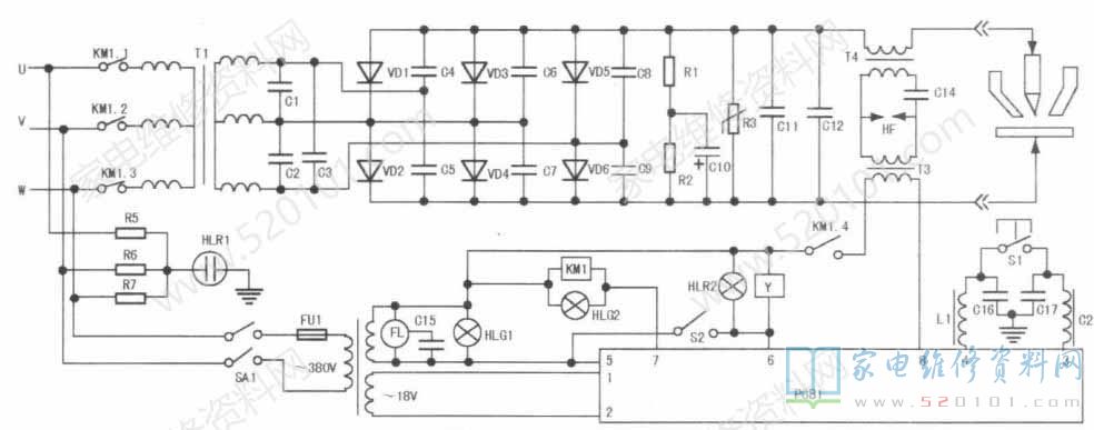 工作过程:三相电源通过交流接触器给三相变压器供电,变压器的次级整流后,得到适合于等离子弧切割的直流电源。交流接触器由程序控制电路控制。