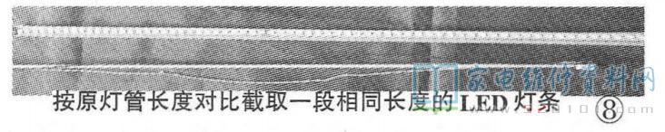 按原灯管的长度对比好新换的LED灯条截取相同长度,多余的LED去掉,一般截取时有个规律,每三只LED灯珠为一组,因为和这灯条匹配的LED恒流源板子是12V供电的。