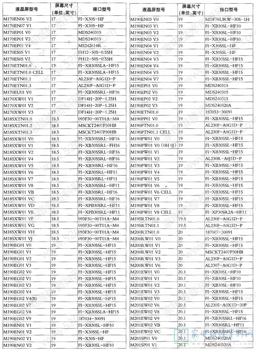说明:Auo是友达光电的简称,其液晶屏的命名规则如下:第一位表示用途,“B”表示笔记型电脑用,“G"表示工业用,“T”表示电视用,“M”表示桌上电脑用,‘H”表示手机用,“C”表示车载设备用, “A”表示用于可移动产品(如数码相机、PDA等);第2~4位为尺寸,如“170”表示17荚寸;第5位表示分辨率,具体含义见表1;第6位表示宽屏/普屏,“N”表示普通型,“W”表示宽屏型;最后两位为产品代次,如“01”表示第一代产品,“03”表示第三代产品。