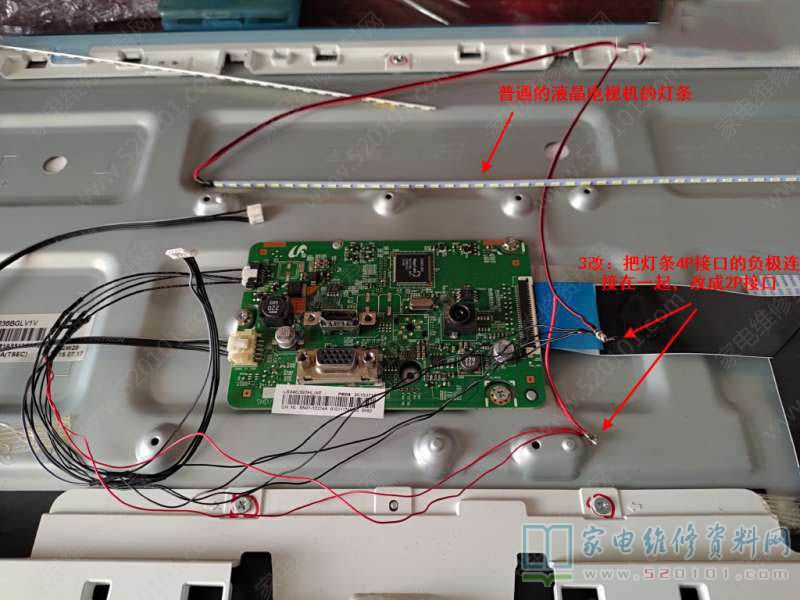 接修一台三星S24D360HL液晶显示器,故障开机指示灯蓝灯亮,背光一闪一闪的。拆机查出是灯条烧了听客户说已经换过两次灯条了看来是通病电流1.142A太高灯条发热严重烧坏。仔细研究了一下作了以下改动:1改:把灯条升压场管的S脚三个10欧电阻去掉改为15欧电阻。2改:把灯条升压场管的D脚两个68欧电阻去掉一个。3改:把灯条4P接口的负极连接在一起,改成2P接口接普通的液晶电视机的灯条(长度300MM)。