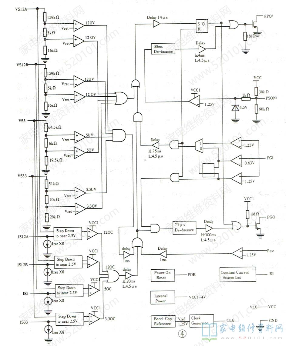 +3.3V过、欠电压保护电路的检测输入点为M10的13脚(vS33端),其OVP点为3.8V~4.OV,典型值为3.9V,UVP点为2.8V~3.0V典型值为2.9V。+5V过、欠电压保护电路的检测输入点为M10的14脚(Vss端),其OVP点为5.6V-6.0V,典型值为5.8V,UVP点为4.2V~4.6V典型值为44V.+12V过欠电压保护电路有两个检测输入点,分别为MIO的⑧脚(VS12B端)、12脚(vs12A端),其oVP点为135V-142V,典型值为14V,UVP点为10.3V~11V ,典型值为10.8V。