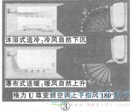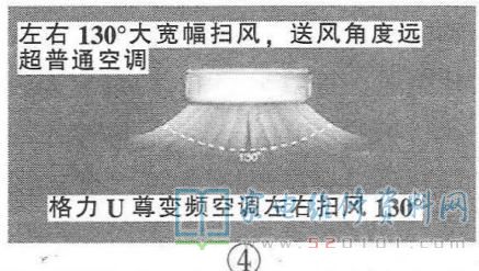 格力首创的“运动导风机构”采用齿轮驱动上下导风板(见图2)与左右扫风叶片进行完美配合,实现了上下180°(见图3)、左右130°(见图4)超广角、大宽幅扫风,实现了室内无盲区送风,循环风量比传统空调增大10%~30%。地毯式制热送风、瀑布式制冷送风,风速均匀,体感更觉舒适。