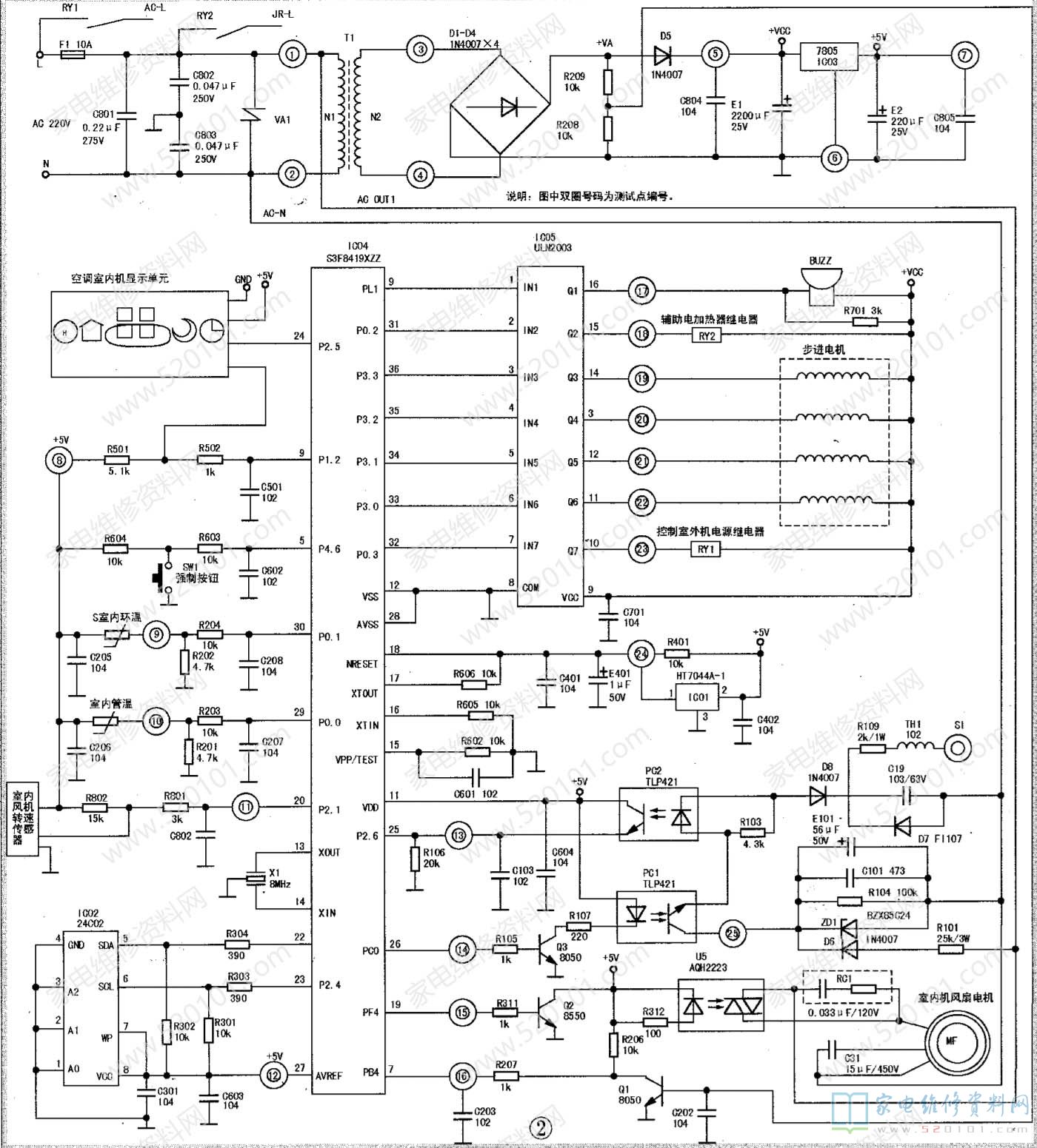 在室内机EEPROM中,记录着空调运行的一些参数,如室内风机的风速、显示屏的亮度变频值、温度保护值等。本机的EEPROM采用24C02 (IC02), 其SDA、SCL端分别与单片机的②脚②脚连接,进行数据处理。