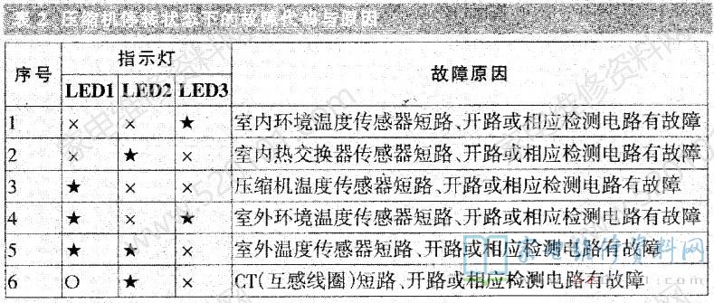 在压缩机停转状态下,若控制系。统正常,则LED01~LEDO3均为熄灭状态若控制系统不正常,其故障代码与原因见表2。