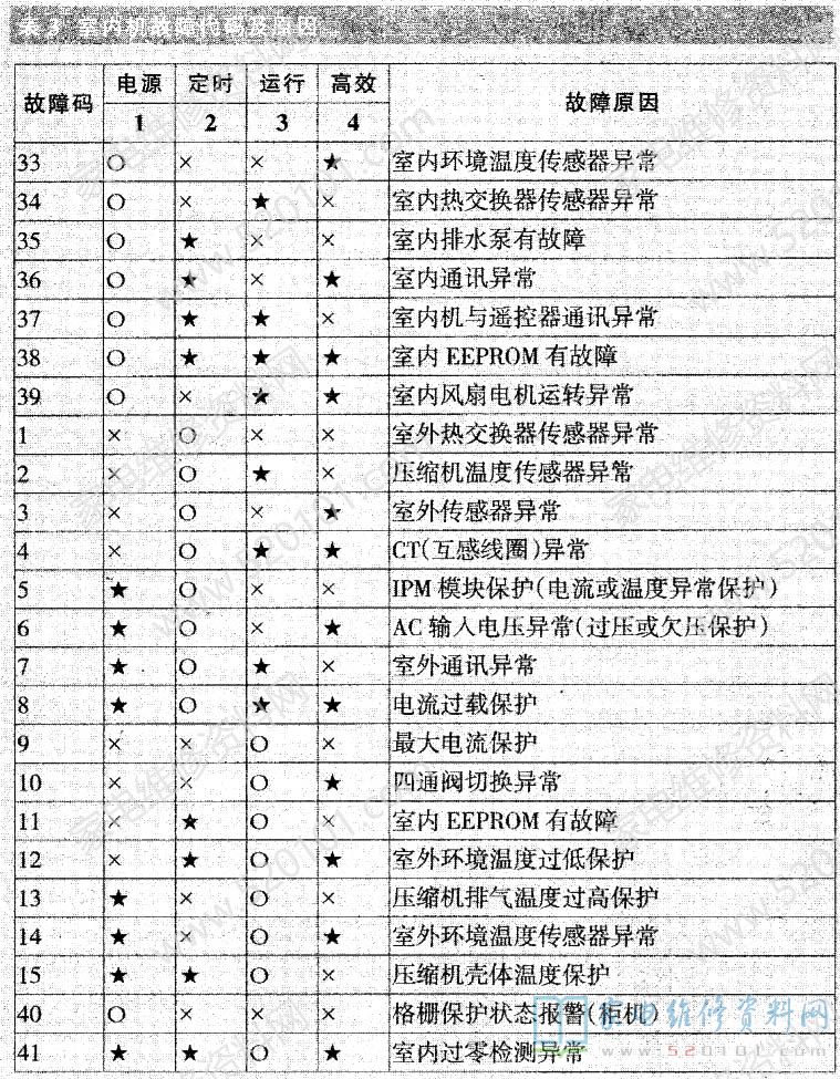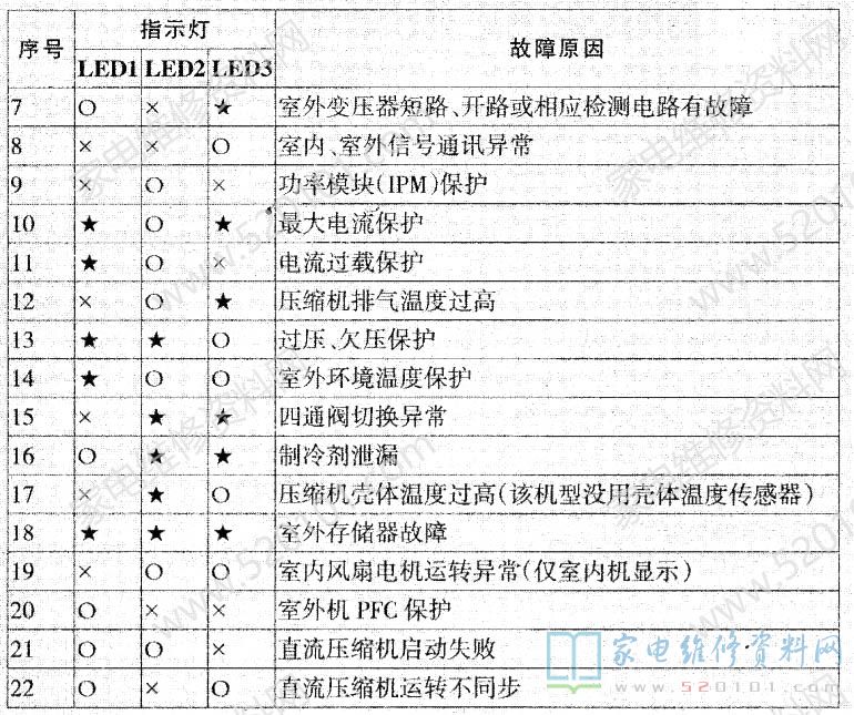 在压缩机运行状态下,若压缩机的运转频率升降正; LEDO1~ LED03均为闪烁状态;若此时压缩机的运转频率不能进行正常的升降,其故障代码与原因见表1。