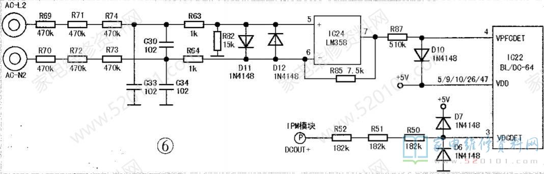 为了防止空调因供电电压过高而损坏,故在室外机电路中设置了过压检测电路,如图6所示,AC220V电压经整流、滤波电路后,i输出到IPM模块的P、N端。IPM模. 块的P端(DC oUt+)通过电阻R50~R52限流降压后送到IC22的③脚,作为电压检测信号,供给单片机内部的A/D电路进行比较处理。