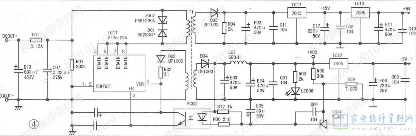 初级副绕组中产生的脉冲电压经二极管D02整流,电阻R02、电容E01滤波后,送到IC11的④脚,为IC11供电。