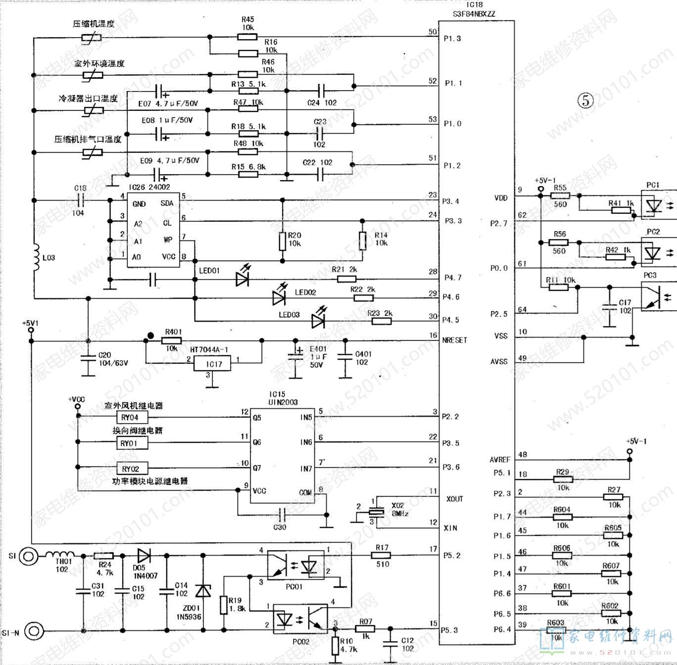 该机室外机控制系统所用单片机电路如图5所示。IC18的16脚与HT7044A(IC17)等元件组成上电复位电路,+5V-1电源从IC17的②脚输人,经IC17的内部电路处理后,从①脚输出一个上升沿脉冲,送到单片机S3F84NBXZZ(IC18) 的16脚,芯片复位,电容E401起调节复位延时时间的作用。