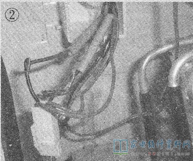 接修一台海信BCD-405WBP冰箱,蒸发器化霜干净,但接水槽结冰严重,如图1所示。由于该机接水槽加热器与蒸发器加热器并联,则故障原因可能是接水槽加热器坏或接插件接触不良。首先拔下接水槽加热器,测得其阻值为3kΩ,正常;接着测得接水槽加热器箱体上接头之间的阻值为0Ω,明显异常!因为两组加热器并联,此处正常阻值应为蒸发器加热器的阻值(约400Ω)。检查此处连线,发现黑线与蓝线位置接反。切断此处的黑线与蓝线,套上黄蜡管,再将蓝线与黑线交换连接,如图2所示。