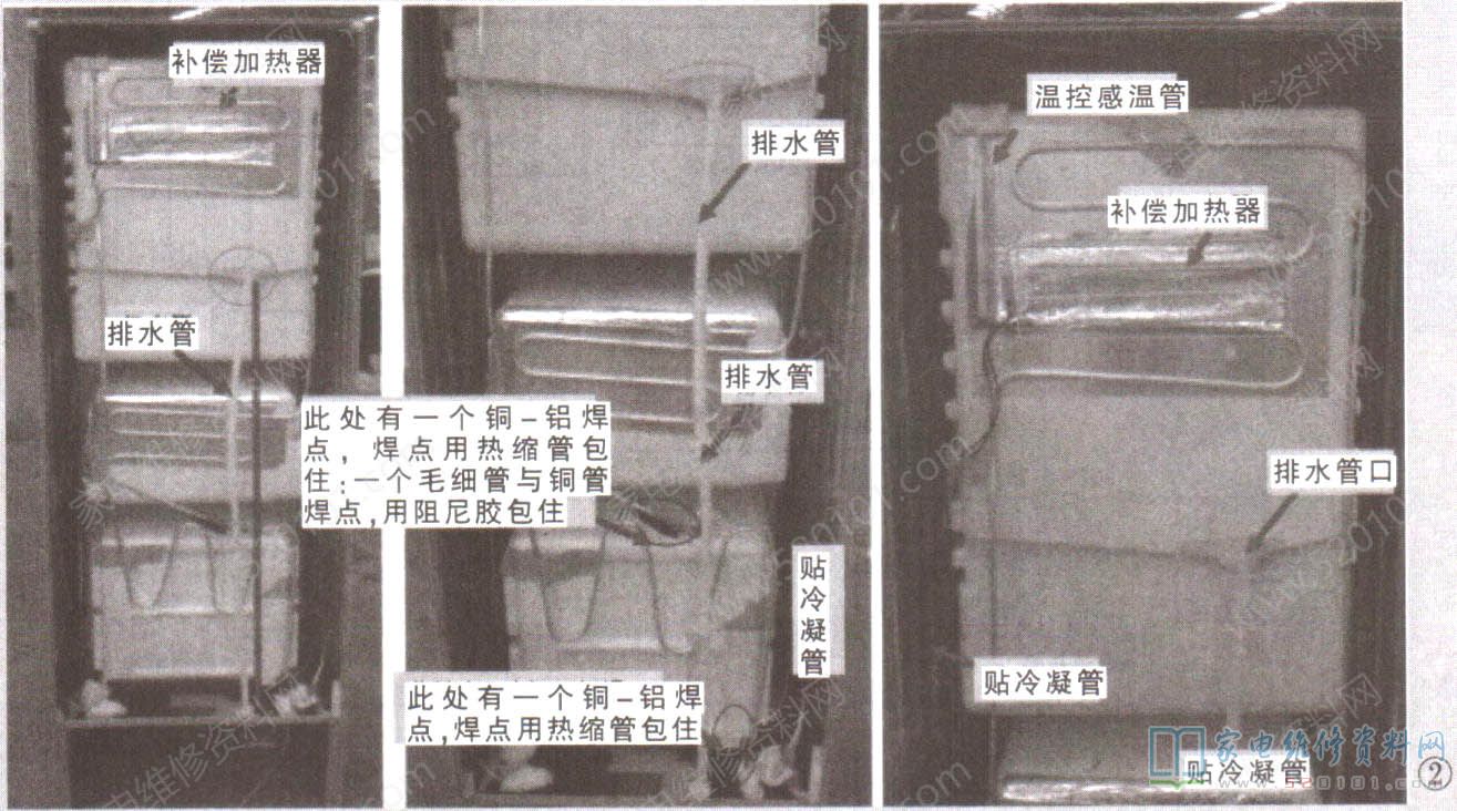格兰仕BCD180、BCD220冰箱内部只有3个焊点,其中两个为铜一铝焊点,一个为铜一铜焊点:内置排水管与补偿加热器,箱板两侧贴有镀锌冷凝管,管路走向分别如图1、图2所示。
