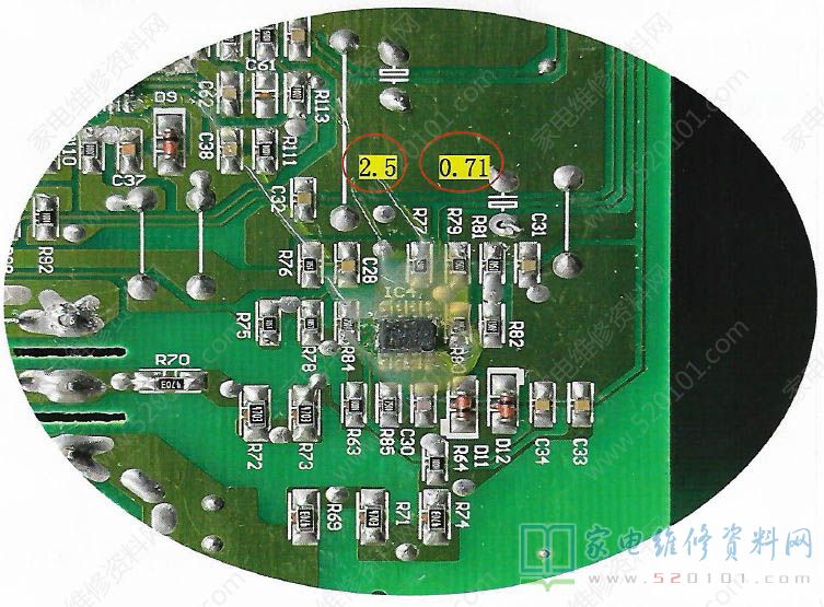 实测5脚电压为0.71V, 7脚电压为0.81V,其中易损元器件是R75 R77 R84,当出现无故障代码,或者没有高频时请优先考虑此处电路。
