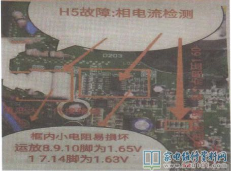 故障检修:1、三组相电流静态工作电压为1.6V-1.65V,哪点不正常则查相对应运算放大器;2如果三组相电流均不正常,则查运算放大器;3.硬件保护CSC脚电压不能超过0.5V,高于该电压则报H5故障;4.六路驱动电阻任意开路阻值变大报H5;5.模块H自身保护输出脚为0V时报H5;6.自举电路出错,报H5。