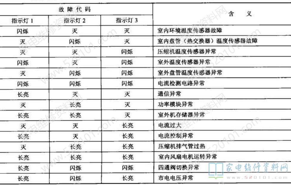 (1)进入方法 空调器进入保护状态后,维修人员可按下遥控器上的“传感器切换”键,室内机操作板上的指示灯会显示故障内容,按压“传感器切换”键的时间超过5s,电脑板进入故障检测和显示状态。 (2)室内机故障代码...