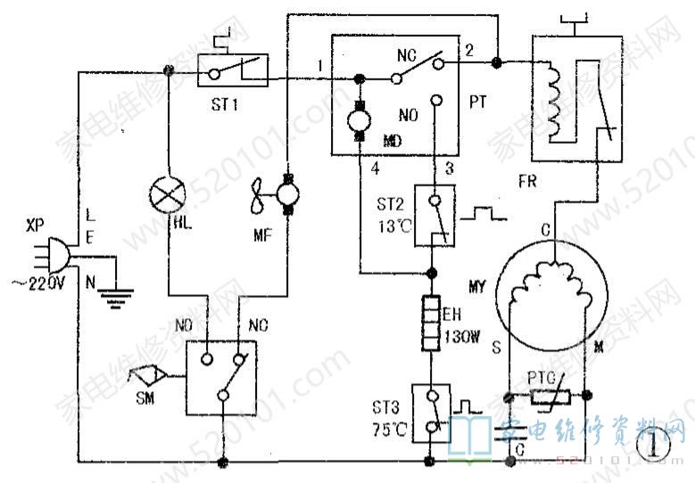 接修一台华凌BCD-182WE型无霜冰箱,冷冻室微冷,冷藏室不凉,制冷效果差。除霜原理:该型冰箱控制电路原理见图1。插上电源插头XP ,220V市电被引入冰箱电路,经制冷温控器ST1加至电动定时器PT①脚,PT也称除霜定时器,由...