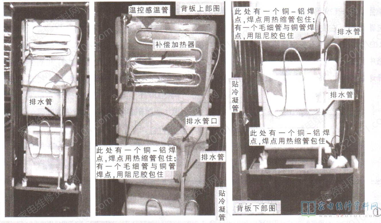 格兰仕BCD180、BCD220冰箱内部只有3个焊点,其中两个为铜一铝焊点,一个为铜一铜焊点:内置排水管与补偿加热器,箱板两侧贴有镀锌冷凝管,管路走向分别如图1、图2所示。 ...