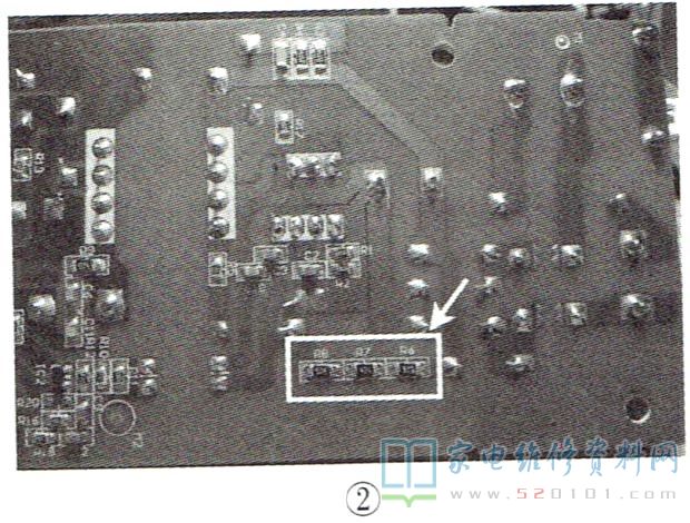 GK6105S送来的极化控制信号经R159、R162加至Q15基极,以控制其导通或截止,进而控制Q14导通或截止。当Q14导通时,R202接入电路;当Q14截止时,R202不接入电路。在这两种状态下,LSP5527⑤脚电压不同,从而达到切换极化电压的目的。拆下U13后测量,极化电压输出端对地不再短路,更换LSP5527后故障排除。将机器装好再次通电试机,无任何反应,拆机检查,发现电源板无电压输出,经查启动电阻R6~R8引脚虚焊,如图2所示,对其补焊后故障排除。