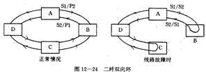 二纤双向环(图12-24)的结构和单向环相同,在一对光纤上以时分复用的方式传送两路业务 信号S1、S2,以及对应的保护信号P1、P2。S1,S2分别传送两个方向相反的信号,如S1用于 传送AB信号,S2传送BA信号。双向环由于采用了时分复用,因此控制相对复杂些。双向环的 业务量与网络节点数及网络上/下路情况有关,在业务量极端分散的情况下,即在每个节点 都进行分插,则双向环达到最大容量K/2 STM-N,其中K为网络节点数。所以,网络业务量 越分散即上/下路越频繁、网络节点数越多,双向环的效率就越高,即双向环与网络的业务 量和节点数有关,这给网络的规化带来了困难。