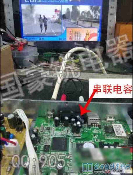 接修一台天诚机顶盒,刚开始是机器不通电故障,拆开机器发现原机电源模块炸裂,修好电源之后,开机无显示,于是采取简易快捷方法,如下图所示,处理后故障修复。