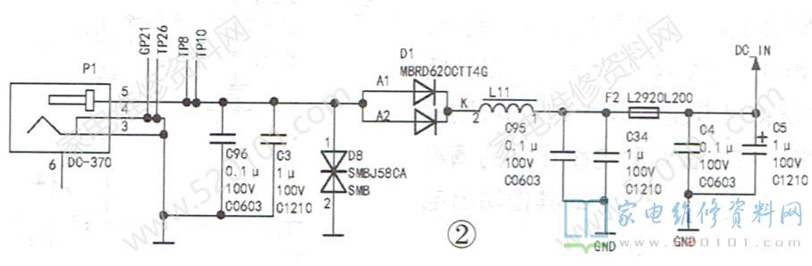 如图2所示,电源适配器的DC12V通过插座P1输入。C96、C3 为滤波电容,D1(MBRD620)为肖特基开关二极管,D8是一只TVS管(瞬变电压 抑制二极管),可吸收因外部电源不稳的浪涌脉冲,L11是一只共模电感 ,可抑制产品自身的共模电磁干扰;F2是一个自恢复保险丝;C95、C34、C4、C5等电容作用是滤波。若后级负载出现过载或短路,电流会急剧增大,自恢复保险丝F2熔断,进入过流保护状态。如果电源极性接反(正极接入P1的③、④脚,负极接入⑤脚),上电瞬间D1反向截止,电路没有输出,处于反接保护状态。