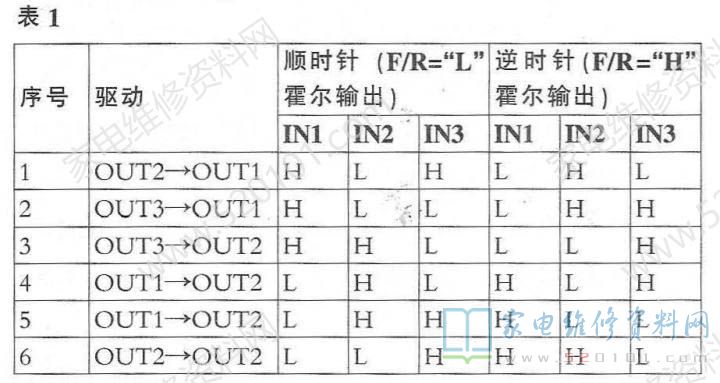 转子转角定位由电机驱动电路板上的3个霍尔传感器(见图1转子旁边的3个黑色4脚元件)完成。控制电路依据3个霍尔传感器的信号组合,控制定子的3相线圈的通电相位,实现电机转动。控制逻辑关系见表1。